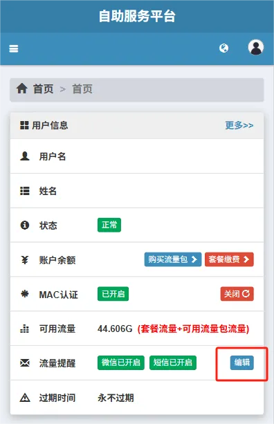 1. 登录 https://g.tju.edu.cn,在用户信息-流量提醒栏目点击编辑。