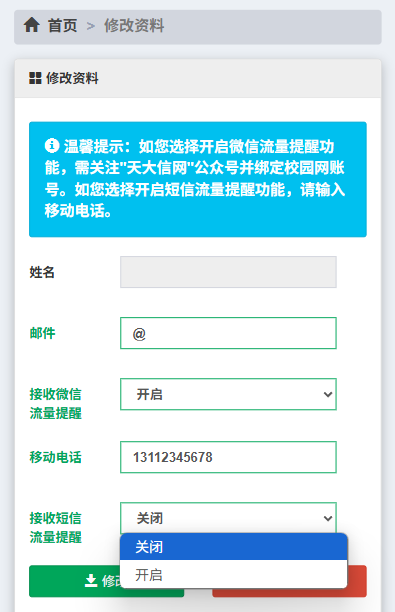2. 在编辑页面接收流量提醒栏选择“关闭”,点击“修改”按钮生效。