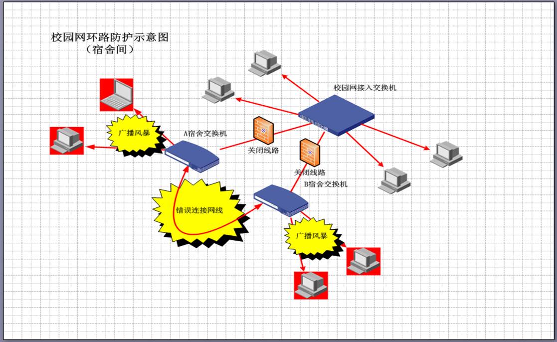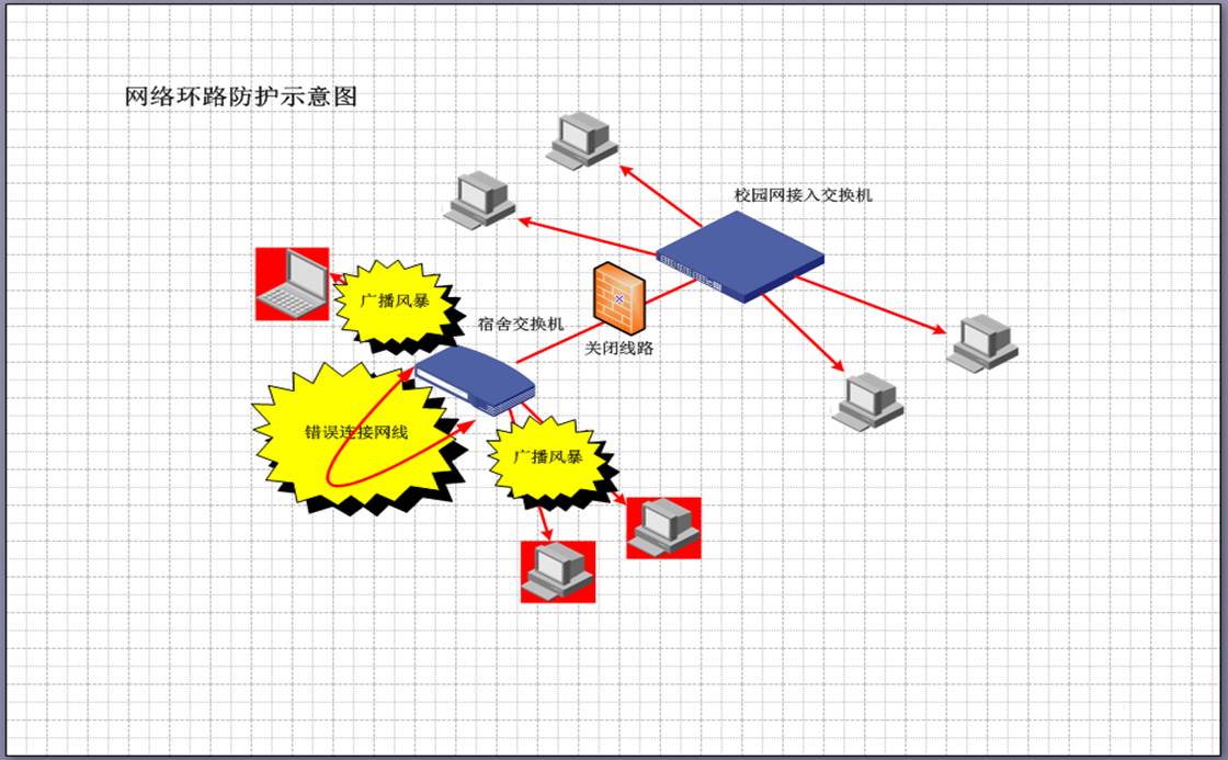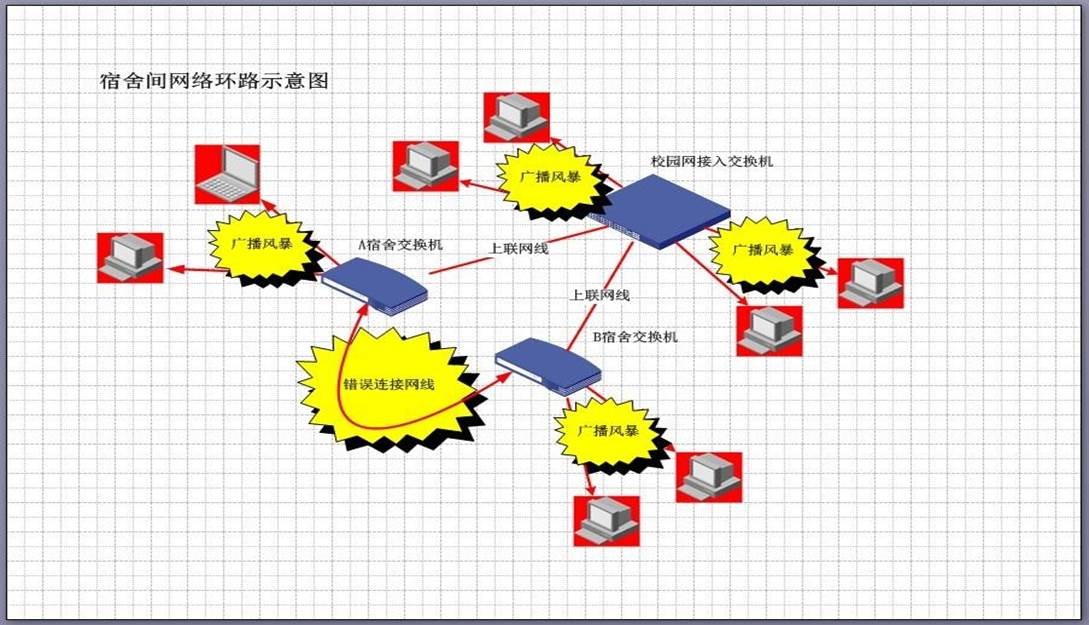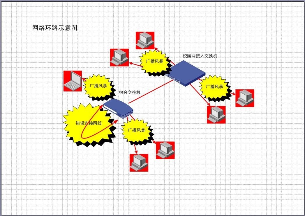同一根网线的两端接到了同一个交换机的接口上,导致交换机数据不断循环扩散形成“广播风暴”,冲击整个局域网的计算机。 试想这样一个场景——安静的下午,听到有人按门铃,你会中断工作或休息,起身看一下发生了什么事情,那么当“广播风暴”冲击网络时,就好像有数十万人排队按门铃,除了不断的起身查看发生了什么事情,你将没有精力进行任何工作或休息,这个例子说明了广播风暴的危害,受到广播风暴冲击的计算机因为不断的响应网络请求变得异常缓慢,而这个危害往往由网络环路引发。