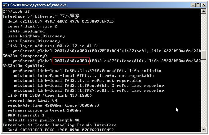 2.查看ipv6地址(注意此处:必须要以2001:da8:a000:开头