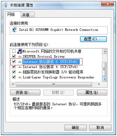 1.和在windows Xp下一样,通过ipv6 install进行安装,然后通过ipv6 if 查看ipv6地址获取是否正确,但是需要注意在安装过程中“Internet协议版本6(TCP/IPv6)”要勾选,如图: